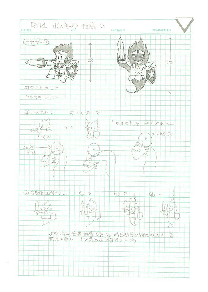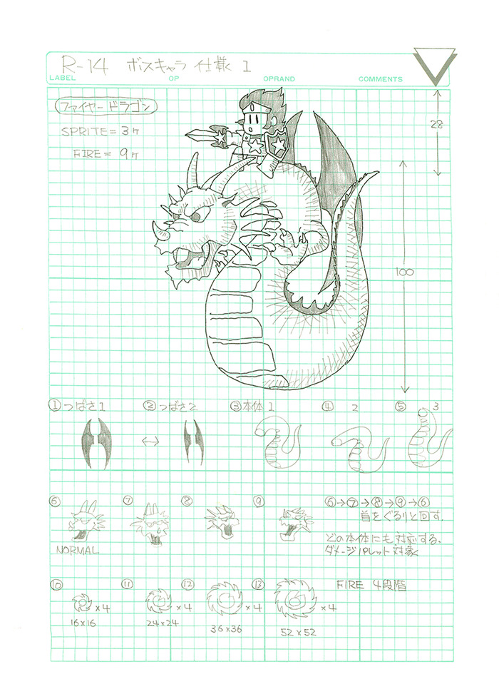 I think of all of the material we'll be including in our book, it's the rough sketches and early design documents that are the most fascinating. As you'll see below, the Wonder Boy III boss characters were planned out on gridded paper, with sizes, animation frames, actions and projectile behaviours explicitly described for the artist. We have around 30 of these in total, detailing each of the bosses from Westone Bit's hybrid shooter/platformer and their attack patterns.